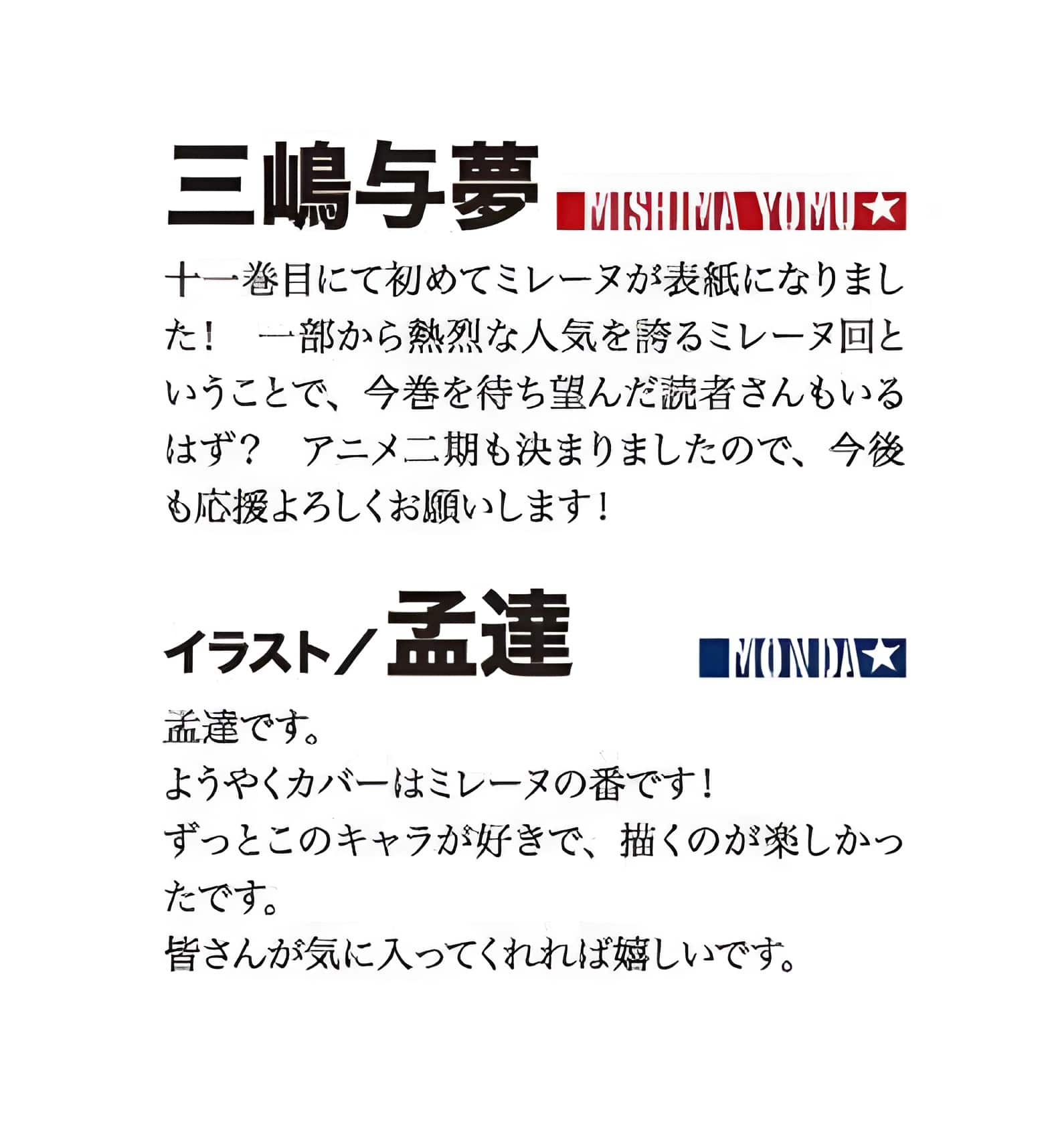 - Mylène Rapha Holfort apparaît pour la première fois sur la couverture du onzième volume. L’histoire parle de Mylène, très populaire auprès de certains lecteurs, et certains d’entre eux attendaient sûrement ce volume avec impatience. Une deuxième saison de l’anime a également été décidée, alors continuez à nous soutenir !